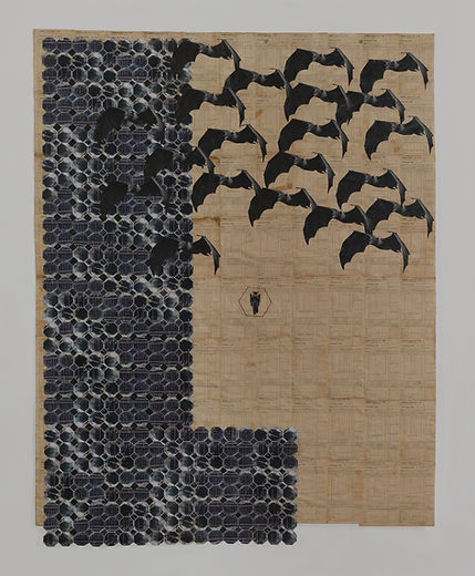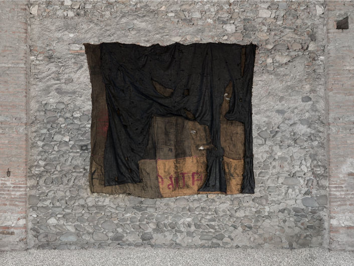 Ibrahim Mahama is known for his monumental installations and assemblages made from reclaimed materials such as jute sacks, shoeboxes, and wooden fragments. Through these transformations, he explores themes of labour, migration, and the circulation of goods within global capitalist systems. His practice reflects a deep interest in how materials bear the traces of crisis, exchange, and collective memory.